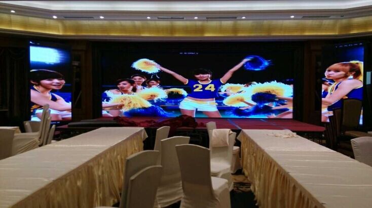 此次P4室内全彩是由彩光科技有限公司全权承制,此主屏有:长:7.424m*高:2.688m=19.96㎡,耳屏有:长:1.28m*高:2.688m=3.44㎡,安装于重庆市梁平县名豪酒店内,可以用来主持婚礼,招开记者招待会,举行宴会等。给大厅锦上添花。