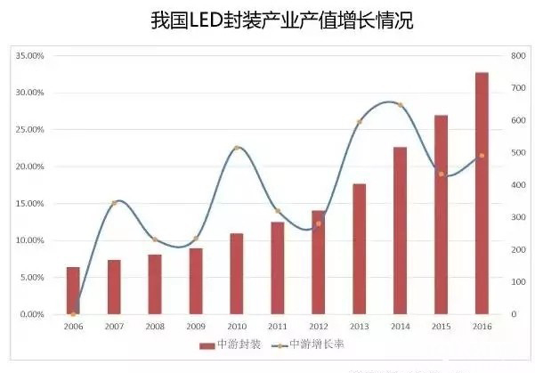 LED封装是半导体照明产业链的中游环节,与应用市场联系最为紧密,它在应用产品总成本上占据30%左右的比重。由于封装的技术含量与投资门槛适中,因此成为各国发展半导体照明产业的重要切入点,获得了较为快速的发展,也成为竞争最为激烈的领域。